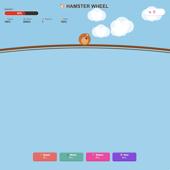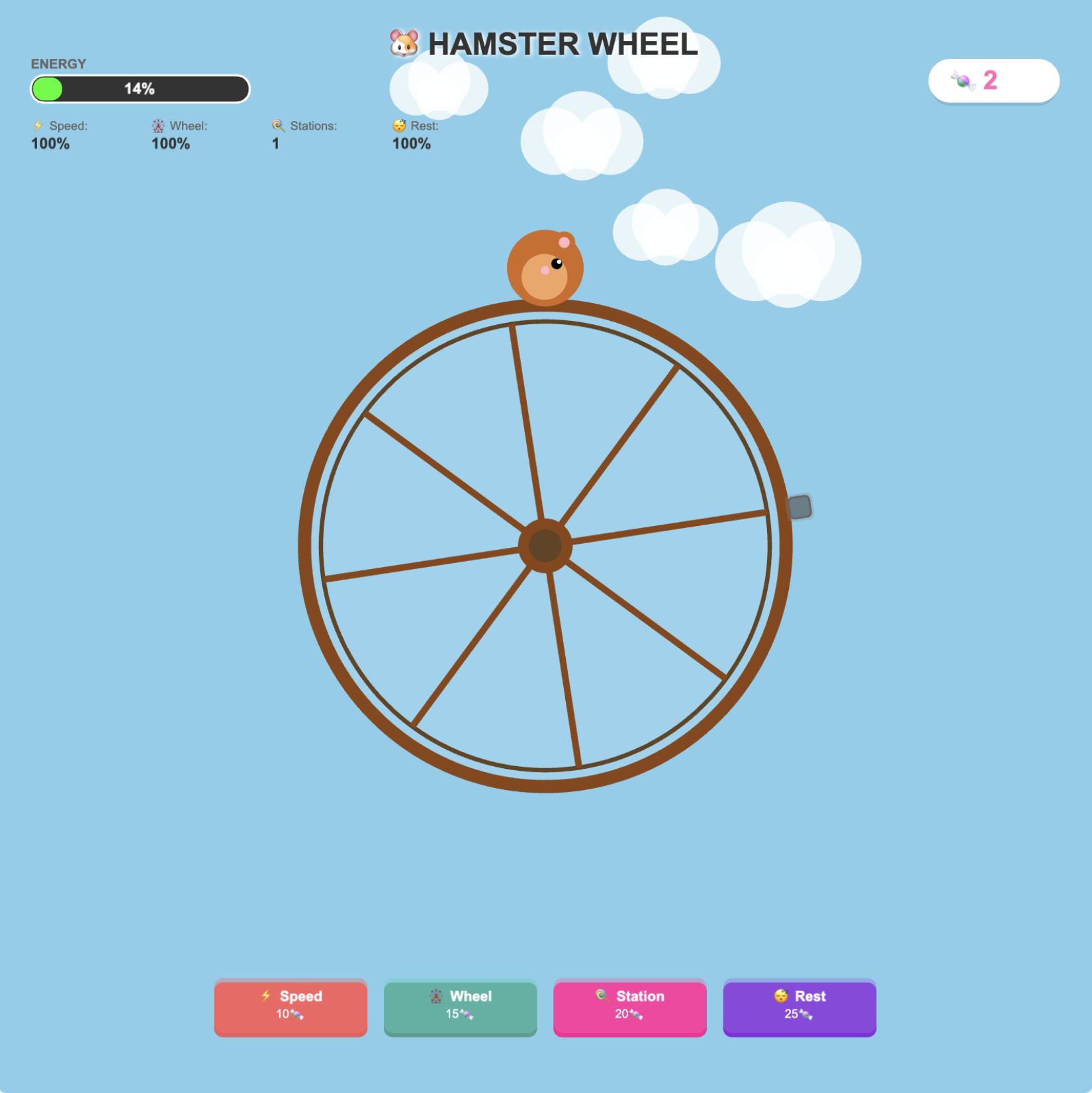 🐹 Hamster Over WheelAn idle game about a very determined hamster. How to PlayYour hamster runs on the wheel all by itself. As the wheel spins, treat stations mounted on the rim pass by the hamster — every time one lines up, the hamster grabs the treat and earns you 🍬. Spend those treats on upgrades, sit back, and watch the numbers go up. EnergyThe hamster can't run forever. The energy bar drains while running.